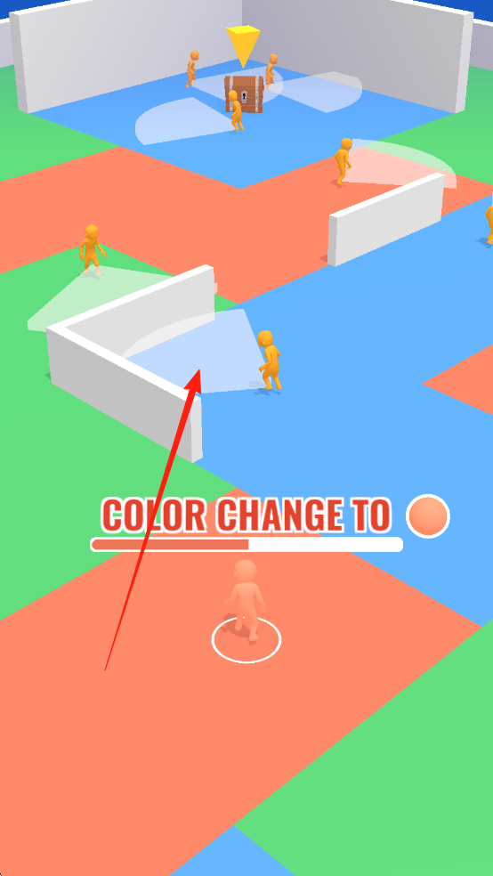 1、場景中有多個橙色小人,地面分綠、紅、藍區(qū)域,上方有COLORCHANGETO及橙色圓圈提示,紅色箭頭指示移動方向。