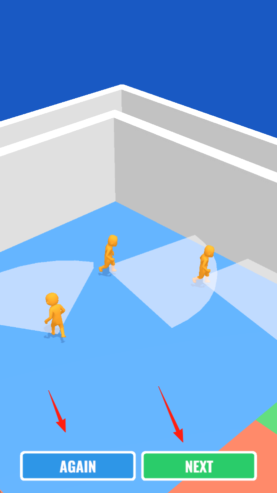 3、游戲結(jié)束界面,有三個橙色小人,底部有“AGAIN(再次游戲)”和“NEXT(下一關)”按鈕,紅色箭頭指向按鈕。