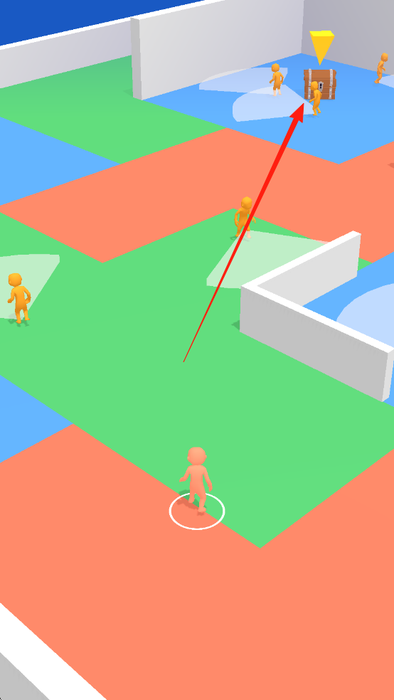 2、橙色小人在綠色區(qū)域,紅色箭頭指向?qū)毾涮帲車衅渌壬∪思八{色、綠色區(qū)域。