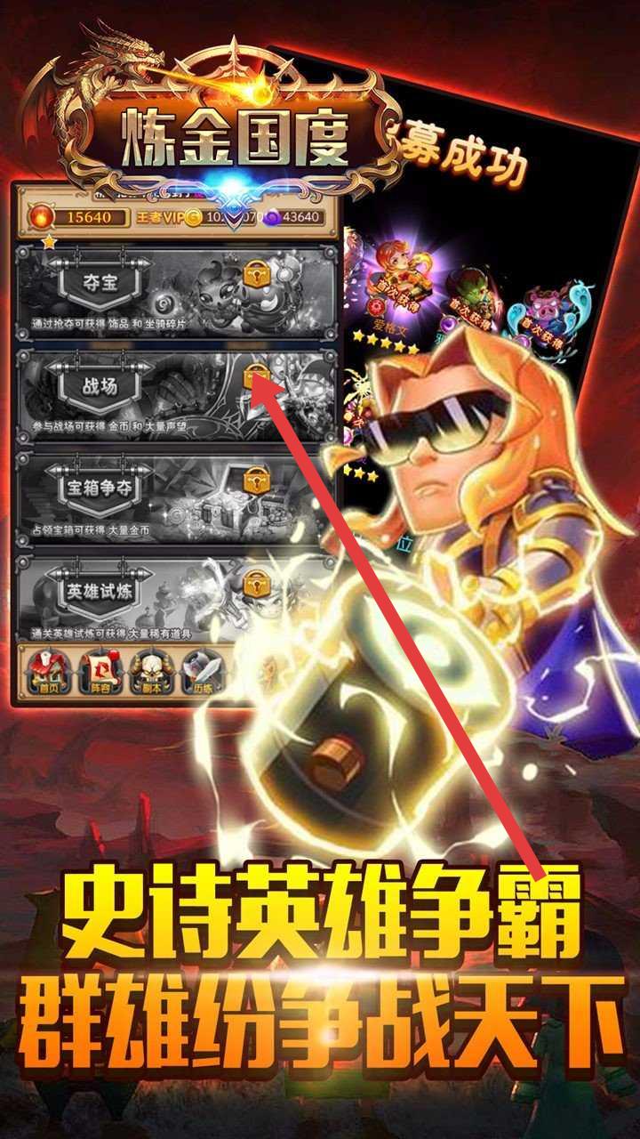 2、在玩法界面,按箭頭提示解鎖“戰(zhàn)場”玩法,參與可獲金幣、聲望,助力英雄養(yǎng)成,提升戰(zhàn)力參與爭霸。