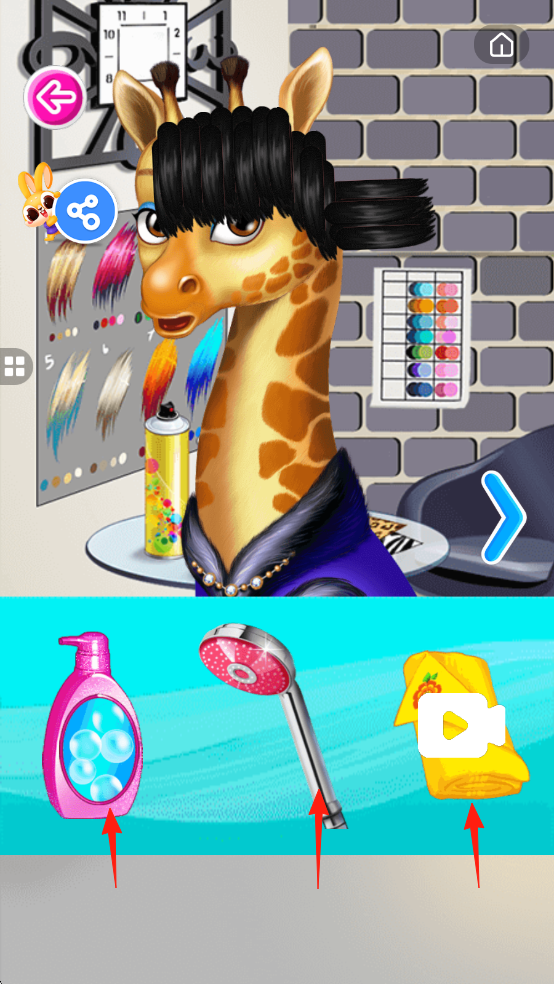 2、美發(fā)操作界面,長頸鹿角色,可使用洗發(fā)水、淋浴、毛巾等工具進行美發(fā)。