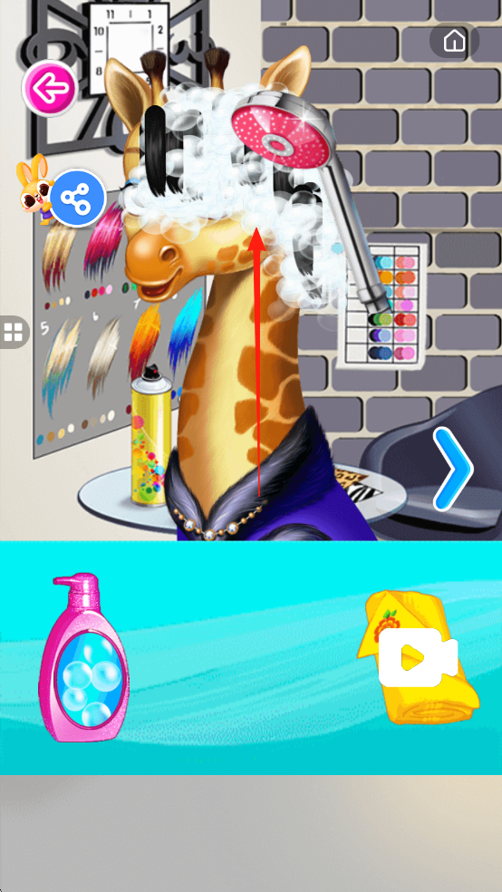 3、美發(fā)操作過程界面,可以根據(jù)紅色指示箭頭把淋浴對準長頸鹿的頭進行洗頭,有泡沫效果。