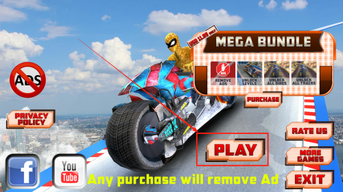 1、輕觸啟動(dòng)按鈕,即刻開啟炫酷的摩托特技冒險(xiǎn)之旅。