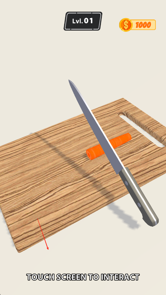 1、進(jìn)入游戲后查看食材列表,點(diǎn)擊選中蔬菜放置案板,點(diǎn)擊屏幕操控刀具將其切成薄片或塊狀,完成切菜階段操作。