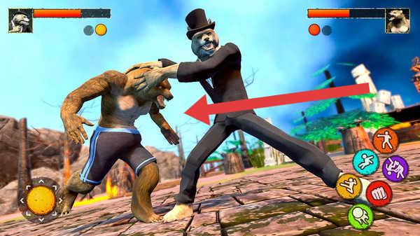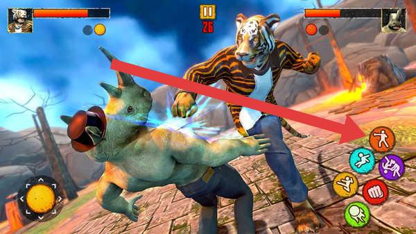 3、操控不同動物角色(犀牛、人形動物),針對敵方弱點(如箭頭指向的攻擊判定),組合技能,擊敗對手。