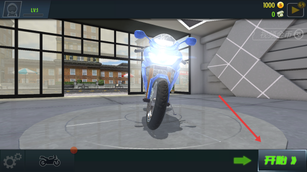 1、車庫選定藍(lán)色摩托車,點擊【開始】,進(jìn)入游戲模式選擇。