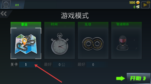 2、選“職業(yè)”模式下的【關(guān)卡1】,點擊開始,進(jìn)入比賽。