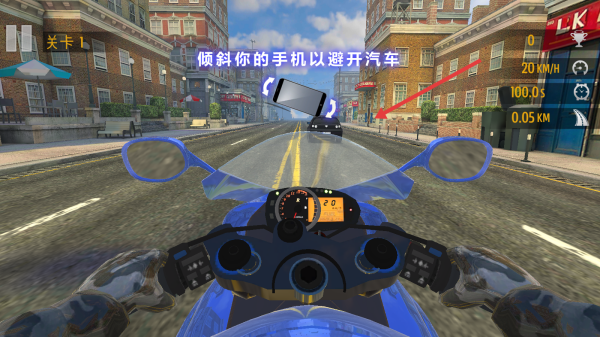 3、駕駛摩托車時,傾斜手機(jī),避開前方汽車,完成關(guān)卡1。