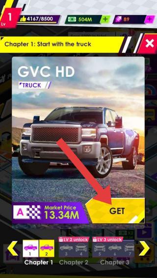 1、Chapter1:Startwiththetruck(第1章:從卡車開始),等級Lv1,還有資源顯示(如504M、89等),“GET”按鈕用于獲取該車輛。