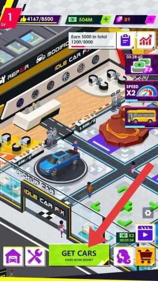 2、呈現(xiàn)汽車修理工坊經營場景,有“GETCARS(獲取汽車)”“Earn5000intotal(總計賺取5000)”等提示,玩家可通過經營修理、改裝汽車等推進進程。