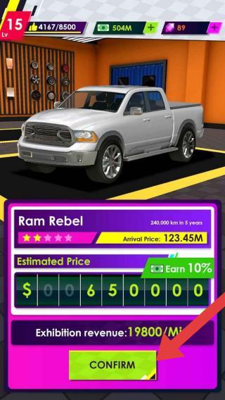 3、點擊【CONFIRM】(確認)”按鈕,用于確認車輛相關操作(如收購、展覽等),游戲等級Lv15,還有資源數值(504M、89)等。