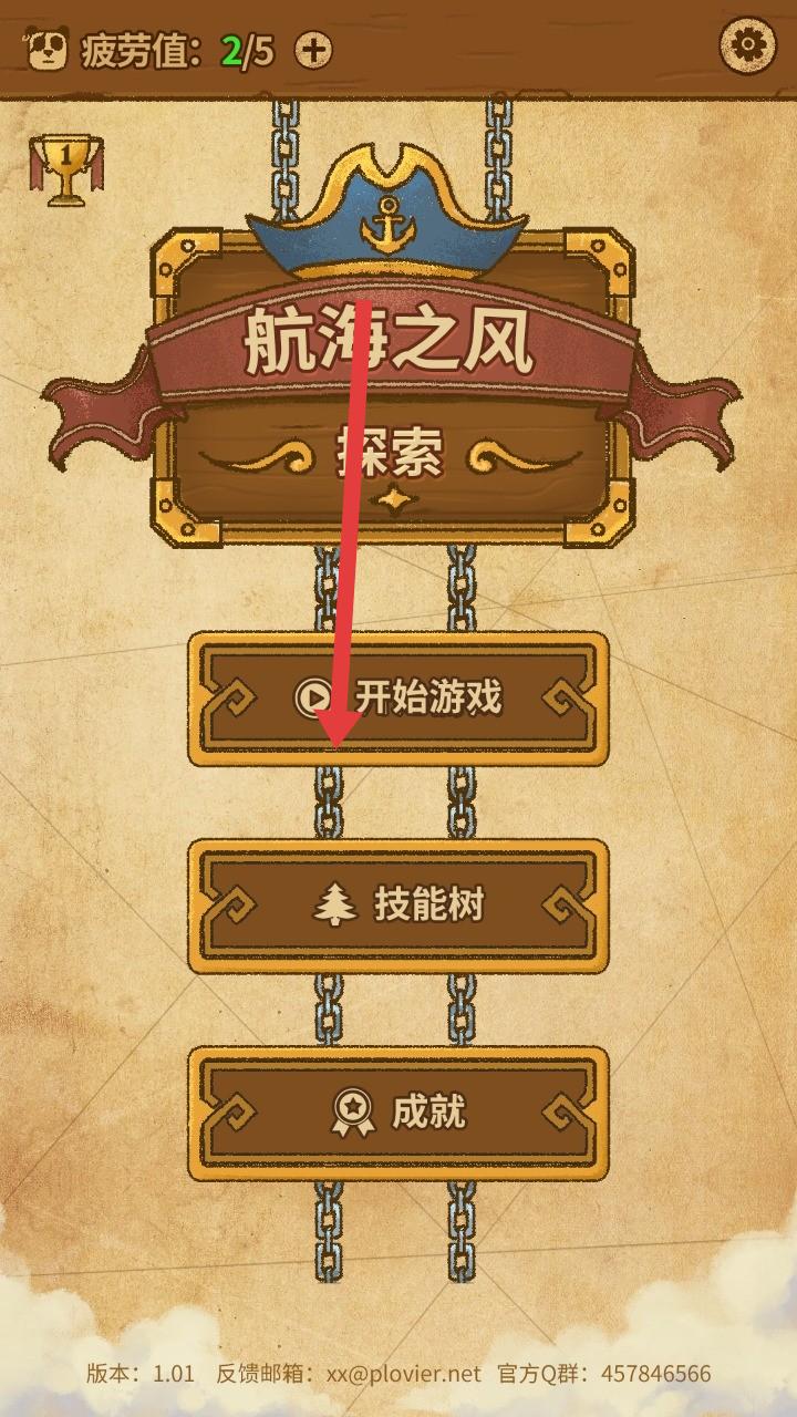 1、進入主界面,先看疲勞值(2/5),點擊【開始游戲】開啟航海,也可先逛【技能樹】【成就】了解養(yǎng)成與目標。
