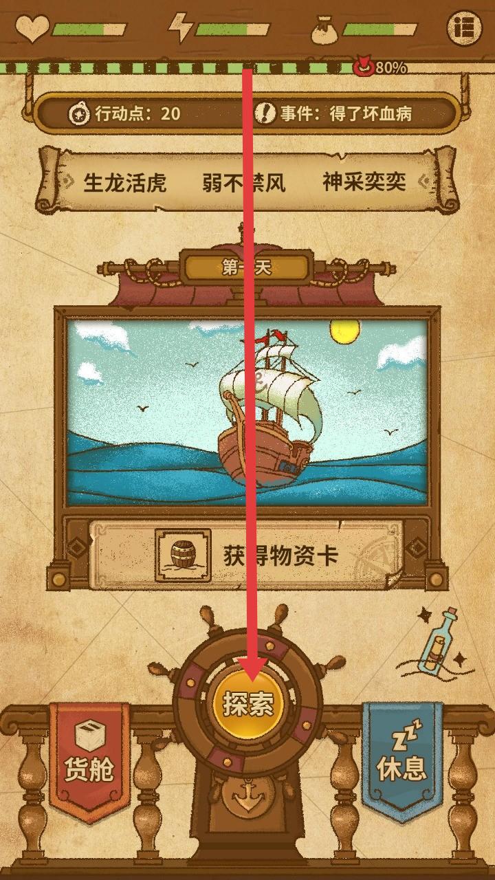 2、在航行界面,關(guān)注行動點(20)、事件(壞血病),用【探索】按鈕推進,按需進【貨艙】管理物資。