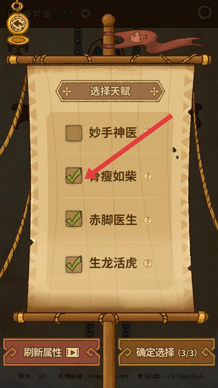 3、到天賦選擇,依據(jù)玩法選天賦(“生龍活虎”增狀態(tài)),不滿點【刷新屬性】換,選好點【確定選擇】強化角色。