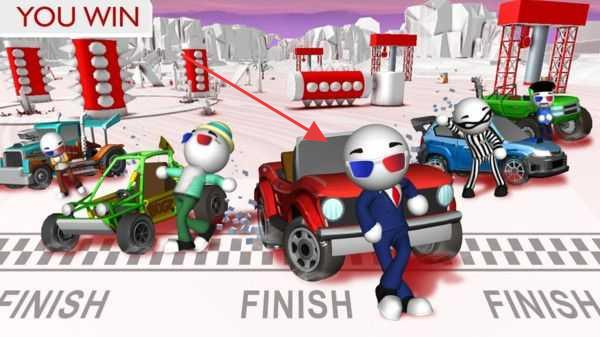 1、在終點線【FINISH】前,駕駛車輛沖線,贏取【YOU WIN】,可碰撞對手(如紅色車撞碎障礙)。