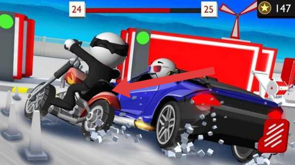 2、比賽中,操控角色(黑衣摩托手)撞擊敵方車輛(藍色跑車),利用碰撞破壞對手,提升排名。