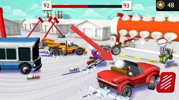 3、在混亂賽道,駕駛紅色敞篷車,撞開障礙物、對手(如紫色摩托),沿路線沖刺,爭取勝利。