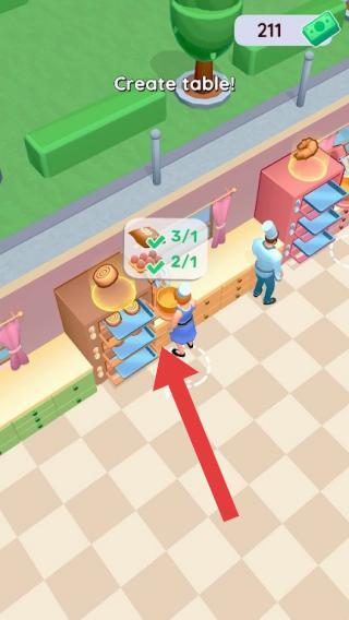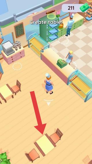3、呈現(xiàn)面包店場景,有角色、桌椅、操作提示“Createtable”(創(chuàng)建桌子),玩家需進行店鋪經(jīng)營操作,屬于模擬經(jīng)營玩法,通過完成任務(wù)推動面包店發(fā)展。
