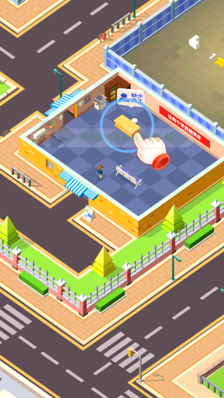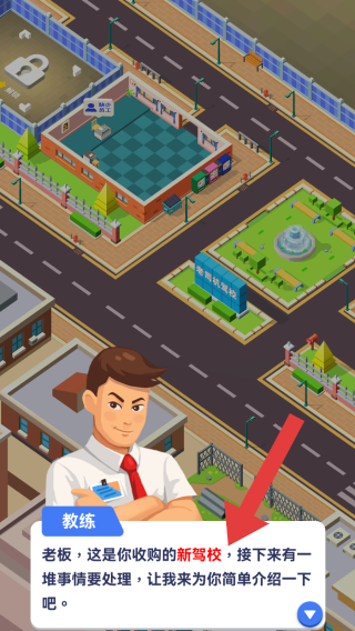 3、玩家扮演駕校老板,畫面呈現(xiàn)駕校建筑及操作指引(手指點(diǎn)擊標(biāo)識),用于推進(jìn)駕校經(jīng)營管理相關(guān)玩法,如布置、升級等操作。