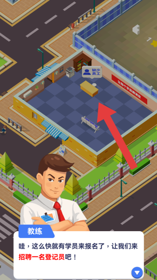 2、玩家扮演駕校老板,此時(shí)需按提示招聘登記員,推進(jìn)駕校經(jīng)營流程,體現(xiàn)人員招聘、業(yè)務(wù)開展等玩法。