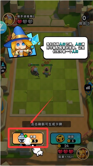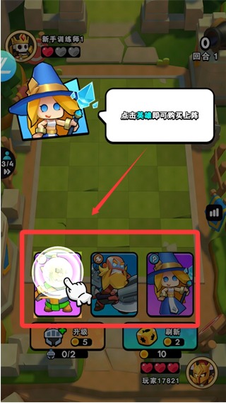 1、在戰(zhàn)斗準備階段,使用金幣雇傭各類英雄,合理升級卡池與等級,尋找最契合戰(zhàn)術體系的角色組合。