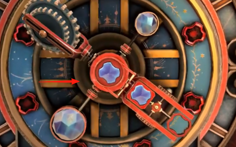 1、觀察齒輪機(jī)關(guān)(紅箭頭),旋轉(zhuǎn)部件,使藍(lán)色水晶對(duì)齊,解鎖第一步。