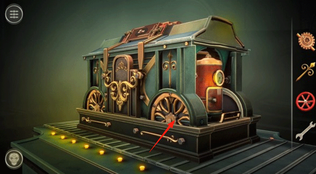 3、檢查蒸汽火車(紅箭頭),用右側(cè)工具(扳手/齒輪)修復(fù)車輪,推進(jìn)解謎。