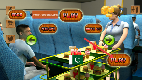 1、進(jìn)入飛機(jī)空姐模擬器的游戲界面,需要點(diǎn)擊右側(cè)木質(zhì)紋理的【PLAY】按鈕,開(kāi)啟游戲之旅。