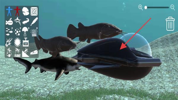 1、進(jìn)入游戲,從左側(cè)工具面板選潛艇、角色、海洋生物等道具,拖入水下場景布置。