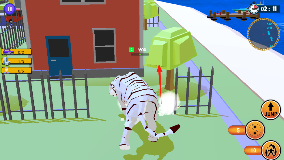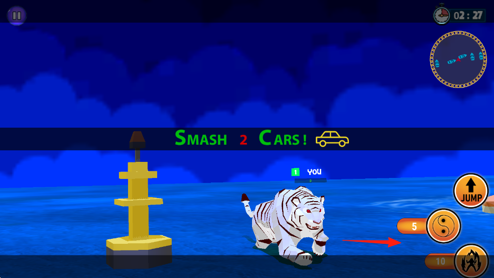1、操控白虎(紅箭頭),在初始場(chǎng)景,看任務(wù)(SMASH2CARS),用右側(cè)技能(八卦),加速移動(dòng),尋找車輛。