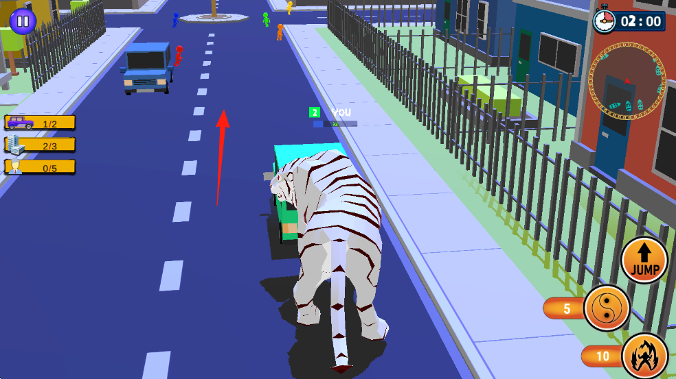 3、在道路(紅箭頭),鎖定綠色汽車,加速撞擊,完成“SMASHCARS”任務(wù)(1/2→2/2),解鎖新破壞目標(biāo)(建筑行人)。
