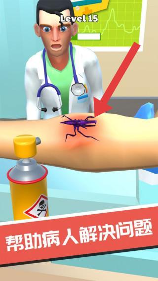 2、呈現(xiàn)醫(yī)生處理病人手臂被蟲子叮咬問題的場(chǎng)景,文字“幫助病人解決問題”體現(xiàn)游戲玩法,玩家扮演醫(yī)生診療患者,圖中顯示為L(zhǎng)evel15關(guān)卡,有道具協(xié)助處理病患狀況。