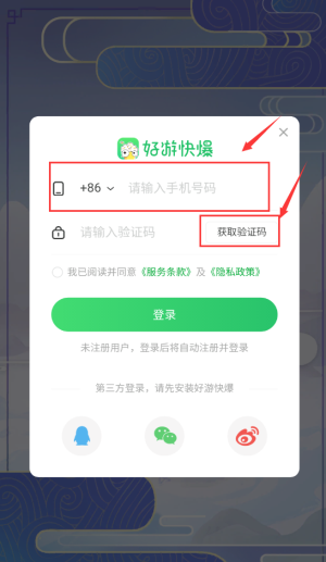 1、打開游戲后,點擊輸入你的手機號,然后點擊獲取驗證碼。