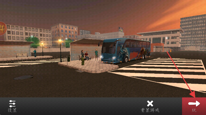 1、在巴士模擬游戲的初始界面,找到右下角紅色箭頭指向的【玩】按鈕并點擊,進入巴士駕駛的游戲場景,開啟駕駛挑戰(zhàn)。