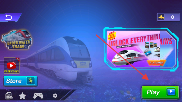 1、在游戲主界面,點(diǎn)擊右下角綠色【Play】按鈕,進(jìn)入【Under Water Train】的水下火車駕駛冒險(xiǎn)。