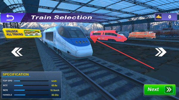 2、在火車選擇界面,挑選箭頭指向的列車(或解鎖更多火車),點(diǎn)擊【Next】,進(jìn)入駕駛準(zhǔn)備階段。