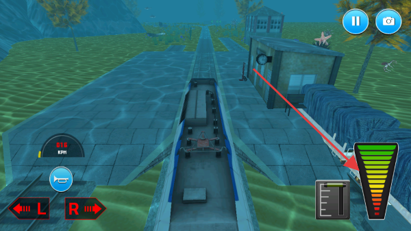 3、水下駕駛時(shí),操作右側(cè)控制桿調(diào)節(jié)速度,配合左側(cè)按鍵,駕駛火車在水下軌道行駛,完成任務(wù)。