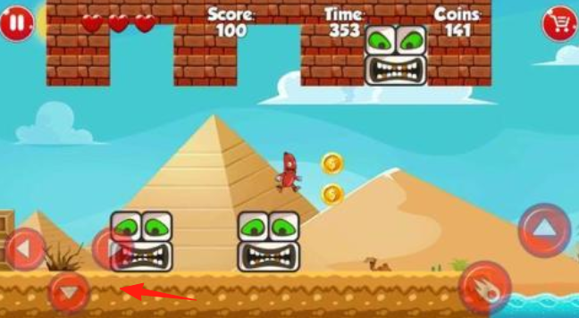 1、沙漠關卡操控香腸人,用左側按鍵移動,避開磚塊怪物,收集金幣,注意地形(懸崖水域)。