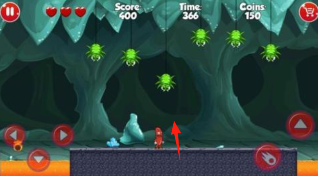 2、洞穴場景長按跳躍,躲避懸掛蜘蛛,利用水晶輔助彈跳,快速通過黑暗通道,積累分數(shù)。