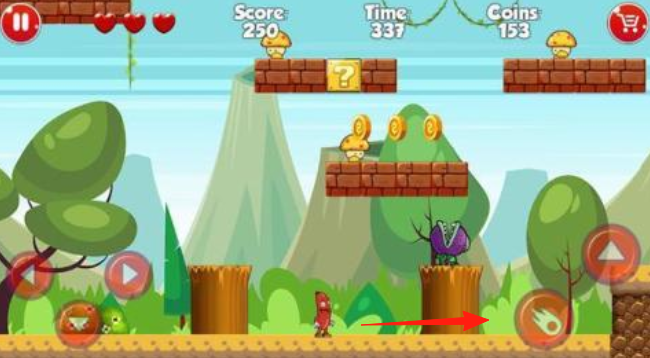 3、森林地圖點擊右側技能鍵,攻擊紫色怪物,跳躍收集蘑菇金幣,借助樹樁跨越障礙,推進冒險。