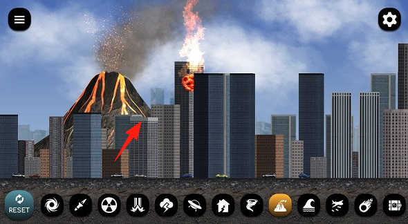 1、災(zāi)難模式選火山火焰等災(zāi)害,點擊釋放,摧毀指定建筑(箭頭高樓),看城市損毀效果。