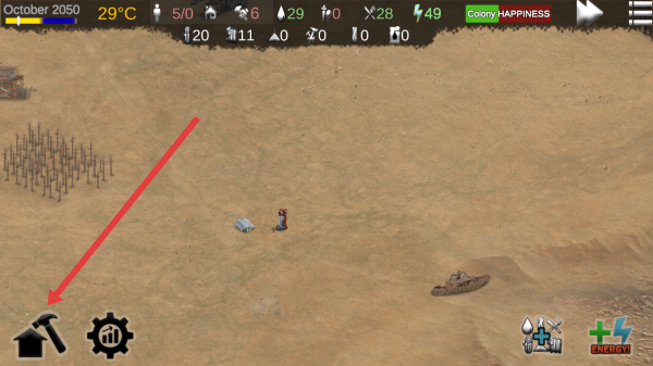 2、在殖民地場景,點(diǎn)擊左下角錘子圖標(biāo),打開建造菜單,準(zhǔn)備建設(shè)生存設(shè)施。