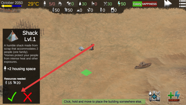 3、選擇“ShacK-Lv.1”(棚屋),確認(rèn)資源(15、20)后,點(diǎn)擊綠色對勾,放置建筑,拓展殖民地。