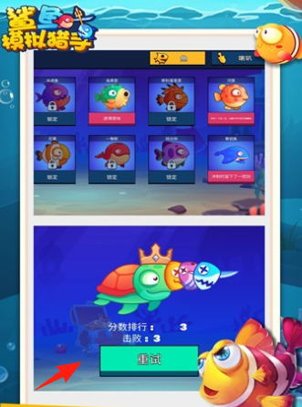 1、魚類養(yǎng)成在圖鑒解鎖升級不同鯊魚,查看分數(shù)排行(當前第3),點擊“重試”開啟新對戰(zhàn)。