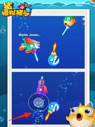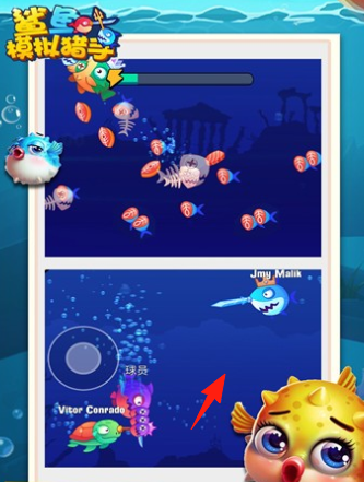 2、實時對戰(zhàn)匹配對手(MartinJamies…),操控鯊魚在海底場景,吞噬小魚、攻擊敵人,積累分數(shù)。