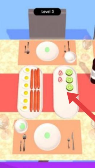 1、顯示“Level3”(等級3),畫面呈現(xiàn)餐桌場景,有餐盤、雞蛋、香腸、獼猴桃等食材擺盤,屬于休閑益智類,玩法是按要求完成餐桌布置、食材擺放等任務(wù)。