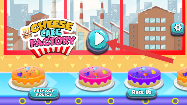 1、實體信息有:標(biāo)題、播放按鈕(開始游戲)、“PRIVACYPOLICY”“RateUs”按鈕、設(shè)置圖標(biāo),玩法是經(jīng)營芝士蛋糕工廠,制作、售賣蛋糕。