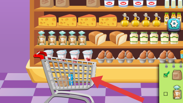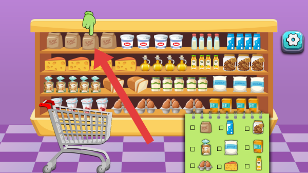 3、超市貨架(陳列奶酪、面包、食用油、罐裝食品、雞蛋等)、購物車、清單(右側(cè)綠色區(qū)域待購物品勾選狀態(tài)),玩法是按清單在貨架選商品放入購物車,完成購物任務(wù)。