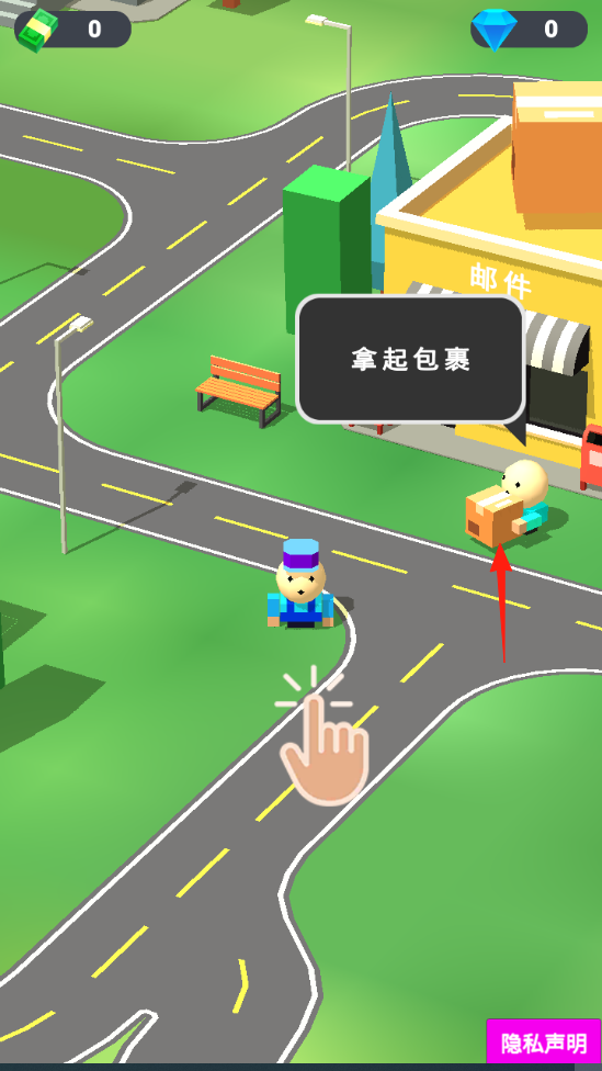 1、包裹收取操控快遞員,到郵件建筑,點(diǎn)擊“拿起包裹”,獲取配送任務(wù)。