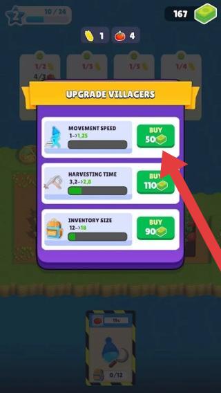 3、呈現(xiàn)“UPGRADEVILLAGERS(升級(jí)村民)”界面,可提升村民移動(dòng)速度、收割時(shí)間、庫存大小等屬性,玩家通過升級(jí)優(yōu)化村民能力推進(jìn)小鎮(zhèn)建設(shè)。